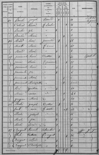 - Les professions de domestiques dans les fermes ne sont pas mentionnées dans les pages du recensement de 1836, sauf exceptions ; nous avons ajouté la mention "Commis" pour les hommes et "Bonne" pour les femmes à condition qu'ils (ou elles) soient hébergé(e)s dans les exploitations agricoles, ne fassent pas partie de la famille proche et aient au moins 15 ans.
