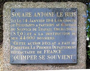 - ↑ Antoine Le Bris, le colosse, mourra d'asphyxie dans le train qui le menait en Allemagne. Les autres connaîtront le camp de Neuengamme. Seuls Jean Le Bris et Jean Le Corre en reviendront. Léon Dolley, arrêté lui aussi, et incarcéré à Saint-Charles, évitera la déportation. François Balès trouvera la mort à Telgruc, lors des combats pour la libération de la presqu'île de Crozon. (Renseignements sur le cambriolage des bureaux du S.T.O. puisés dans le "Finistère dans la guerre", ouvrage déjà cité et le "Journal du Combattant", article de R.J. Poujade, du 25 janvier 1986).