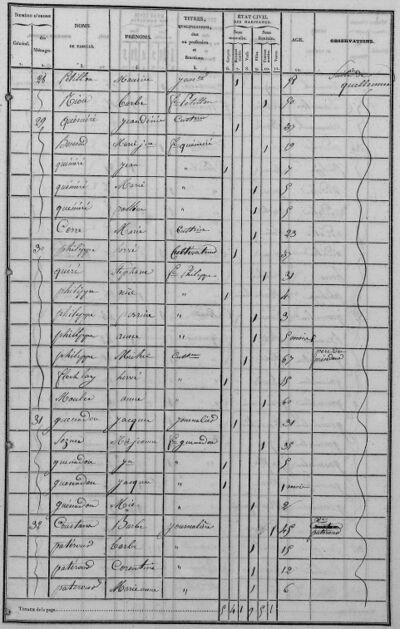 - Les professions de domestiques dans les fermes ne sont pas mentionnées dans les pages du recensement de 1836, sauf exceptions ; nous avons ajouté la mention "Commis" pour les hommes et "Bonne" pour les femmes à condition qu'ils (ou elles) soient hébergé(e)s dans les exploitations agricoles, ne fassent pas partie de la famille proche et aient au moins 15 ans.>