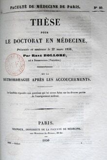 Jean-René Bolloré, avant de partir en voyage comme médecin, et bien avant de devenir l'entrepreneur papetier en succession de son oncle Nicolas Le Marié, présente une thèse intitulée « De la métrorrhagie après les accouchements » en 1850 pour obtenir le diplôme de docteur en médecine. Il introduit ainsi son sujet : « On doit entendre par métrorragie (de , matrice, et