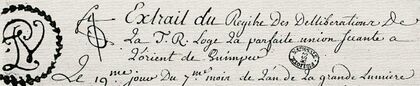 - ↑ 1,0 1,1 1,2 1,3 1,4 et 1,5 La franc-maçonnerie, apparue à Quimper vers 1760-1770 avec la création de la loge La Consolante Maçonne et après notamment l'initiation du célèbre critique littéraire Élie Fréron, fut très vite empêtrée dans une ambiance conflictuelle entre deux loges rivales : L'Heureuse Maçonne et La Parfaite Union. La seconde connaitra un relatif essor et entrainera de nombreux membres de l'élite sociale formée de médecins, avocats, négociants-industriels et hommes politiques : Le Goazre de Kervélégan, Jean-Baptiste Le Breton, Antoine De La Hubaudière, Corentin Vinoc ...