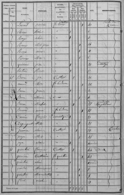 - Les professions de domestiques dans les fermes ne sont pas mentionnées dans les pages du recensement de 1836, sauf exceptions ; nous avons ajouté la mention "Commis" pour les hommes et "Bonne" pour les femmes à condition qu'ils (ou elles) soient hébergé(e)s dans les exploitations agricoles, ne fassent pas partie de la famille proche et aient au moins 15 ans.