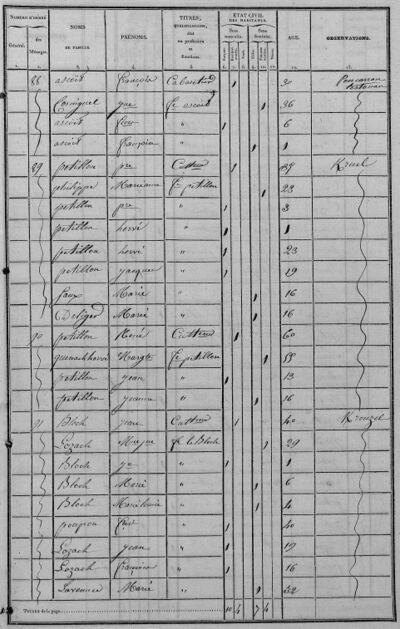 - Les professions de domestiques dans les fermes ne sont pas mentionnées dans les pages du recensement de 1836, sauf exceptions ; nous avons ajouté la mention "Commis" pour les hommes et "Bonne" pour les femmes à condition qu'ils (ou elles) soient hébergé(e)s dans les exploitations agricoles, ne fassent pas partie de la famille proche et aient au moins 15 ans.